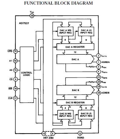 AD7537JN absolute maximum ratings: (1)VDD to DGND: –0.3 V, +17 V; (2)VREFA, VREFB to AGNDA, AGNDB:±25 V; (3)VRFBA, VRFBB to AGNDA, AGNDB:±25 V; (4)Digital Input Voltage to DGND:–0.3 V, VDD +0.3 V; (5)IOUTA, IOUTB to DGND:–0.3 V, VDD +0.3 V; (6)AGNDA, AGNDB to DGND:–0.3 V, VDD +0.3 V; (7)Operating Temperature Range:–40℃ to +85℃; (8)Storage Temperature:–65℃ to +150℃; (9)Lead Temperature (Soldering, 10 sec):+300℃.