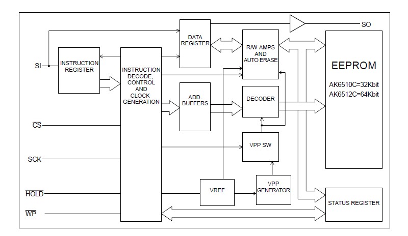 The AK6512CL is a 65536-bit, serial, read/write, non-volatile memory device fabricated using an advanced CMOS EEPROM technology. The AK6512CL has 65536-bits of memory organized as 8192 registers of 8 bits each. The AK6512CL can operate all function under wide operating voltage range: 1.8V to 5.5V. The charge up circuit for high voltage generation needed for write operations is integrated. The AK6512CL serial interface is compatible to a SPI bus. The AK6512CL has 6 instructions: READ, WRITE, WREN (write enable), WRDI (write disable), RDSR (read status register), and WRSR (write status register).