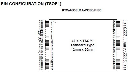 K9K8G08UOA-PCBO features: (1)Voltage Supply: 2.70V ~ 3.60V; (2)Organization Memory Cell Array : (1G + 32M) x 8bit; (3)Data Register : (2K + 64) x 8bit; (4)Automatic Program and Erase: Page Program : (2K + 64)Byte; (5)Block Erase : (128K + 4K)Byte; (6)Page Read Operation: Page Size : (2K + 64)Byte; (7)Command/Address/Data Multiplexed I/O Port; (8)Command Driven Operation; (9)Intelligent Copy-Back with internal 1bit/528Byte EDC; (10)Unique ID for Copyright Protection.